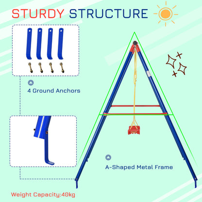 Give children an authentic playground experience, in the privacy of their own surroundings.This classic single swing from Outsunny will let them enjoy hours of fun. Made from metal, with a powder coating for extra strength and durability, the frame is made into an 'A' shape so it stands balanced. The rope is adjustable to cater for different heights. It's finished with a 'U' shaped seat so they can sit safely and comfortably. Suitable for ages 6-12 years.Features:Powder coated metal frame for a stable and balanced coreAdjustable rope length to cater to different heightsBright multi-coloured design they'll loveComfortable and safe 'U' seat, attached to the frame securelySuitable for ages 6-12, maximum load 40kgAssembly requiredSpecification:Color: Blue, Yellow and RedMaterial: Metal, PEOverall Dimension: 155L x 160W x 180H cmSwing Seat Size: 42L x 17W x 4.5H cmRope Size: Diameter 1 x 150L cmWeight Capacity: 40kgCertification: EN71-1 -2 -3 -8Recommended Age: 6-12 Years OldItem Label: 344-020NU