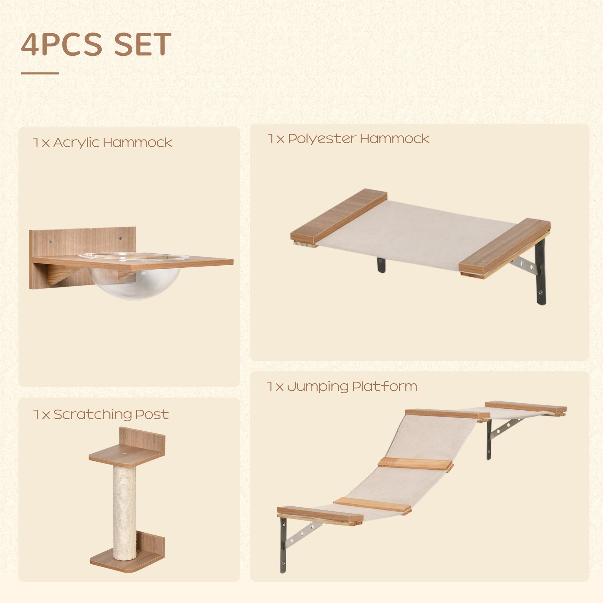 A place for them to jump, their own spots no-one else can get to. This PawHut four-piece on-wall set is a must for all kittens and cats. Set comes with: a clear-bowl hammock, small and long platform and scratching post: each piece with the metal can be attached to the wall - freestanding so you can attach them anywhere you want. Sisal rope wrapped on the post gives cats a place to sharpen their claws safely. It's time to curb their curiosity, all day - every day.