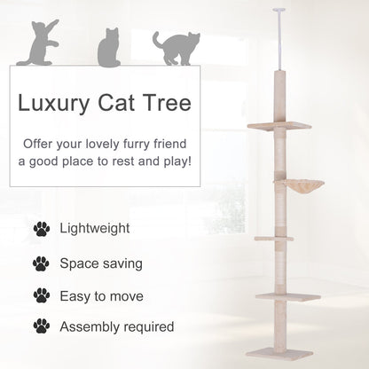 PawHut Floor to Ceiling Cat Tree for Indoor Cats 5-Tier Kitty Tower Climbing Activity Center Scratching Post Adjustable Height 230-260 cm Beige