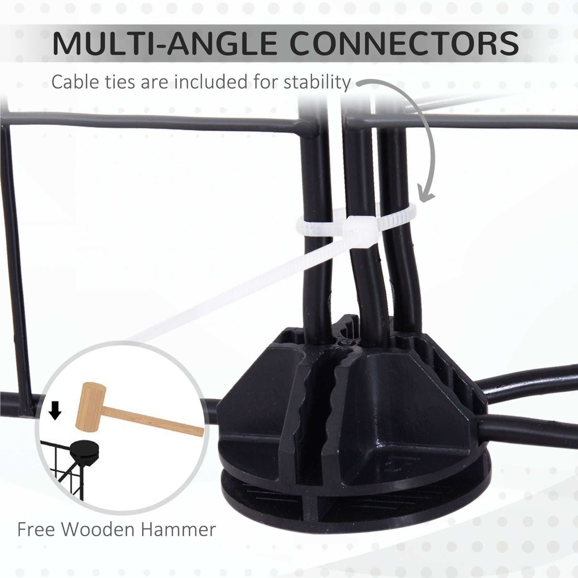 - Plastic cable ties and a wooden mallet included for assembly