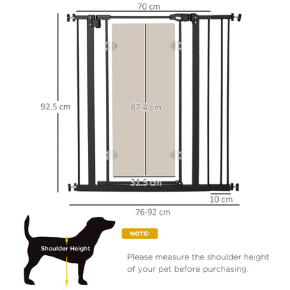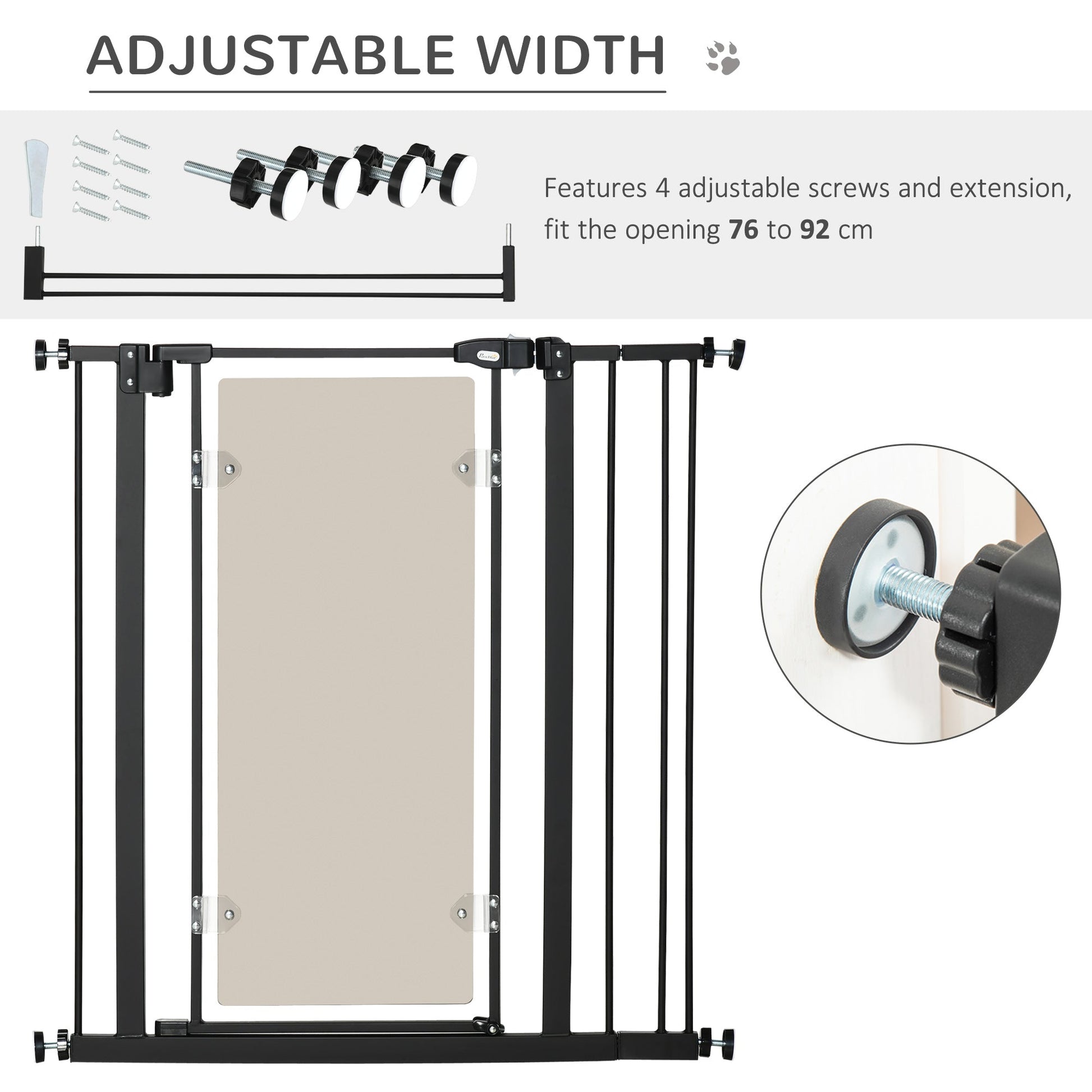 Keep dogs from restricted areas with this PawHut pressure fit stair gate. Suitable for hallways, doorways and staircases, it has an adjustable width of 76-92 cm – perfect for different sized openings. The door automatically closes when its angle is less than 90° – no more worrying about leaving it slightly open. It's pressure-mounted, making it easy to set up; a safe and effective way to stop pets from going where they shouldn't.