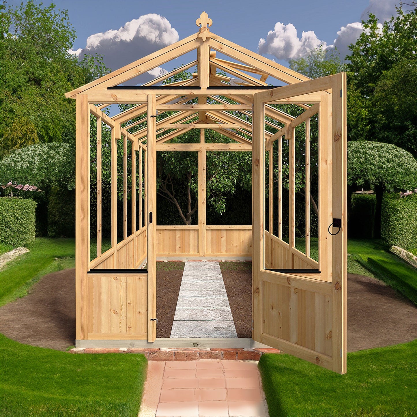 Featuring Shire's quality joinery and completed with an attractive finial and cresting to the roof, the Holkham is both practical as well as charming. The low wooden panels also add a very traditional detail to this lovely building. The greenhouse is glazed with toughened glass and has a single door with traditional gate latch handle. Roof windows have an automatic Bayliss opener supplied. As usual with a greenhouse, no floor is supplied and the greenhouse sits on a pressure treated base rail. Grass, soil or gravel are not sufficient as they will move with the weight of a building. This product is part of the Holkham collection.