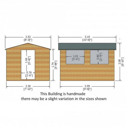Please note - size 8' 3" x 10' 5" is approximate and based on a bird's eye view of the structure, including the roof.