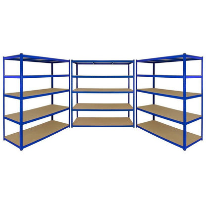 Additional Features: 3 x Extra wide 160cm blue powder coated racking / shelving bays ideal for garages warehouses utility rooms sheds and workshops with 5 thick MDF shelves. 4 layers of powder coated paint maintain a high quality finish. Heavy duty steel frame with a unique T-RAX boltless bar lock mechanism allows the unit to simply lock in place to create a sturdy shelving unit. Additional under-shelf supports to prevent bowing. No bolts are required all you need is a mallet. Each shelf has a weight tolerance of 265kg for evenly distributed loads (up to 1325kg per bay!) and the shelves are deeper than industry standard shelving. Each bay can be split in two to create two sturdy workbenches. Dimensions : 1600mm (w) x 600mm (d) x 1800mm (h).