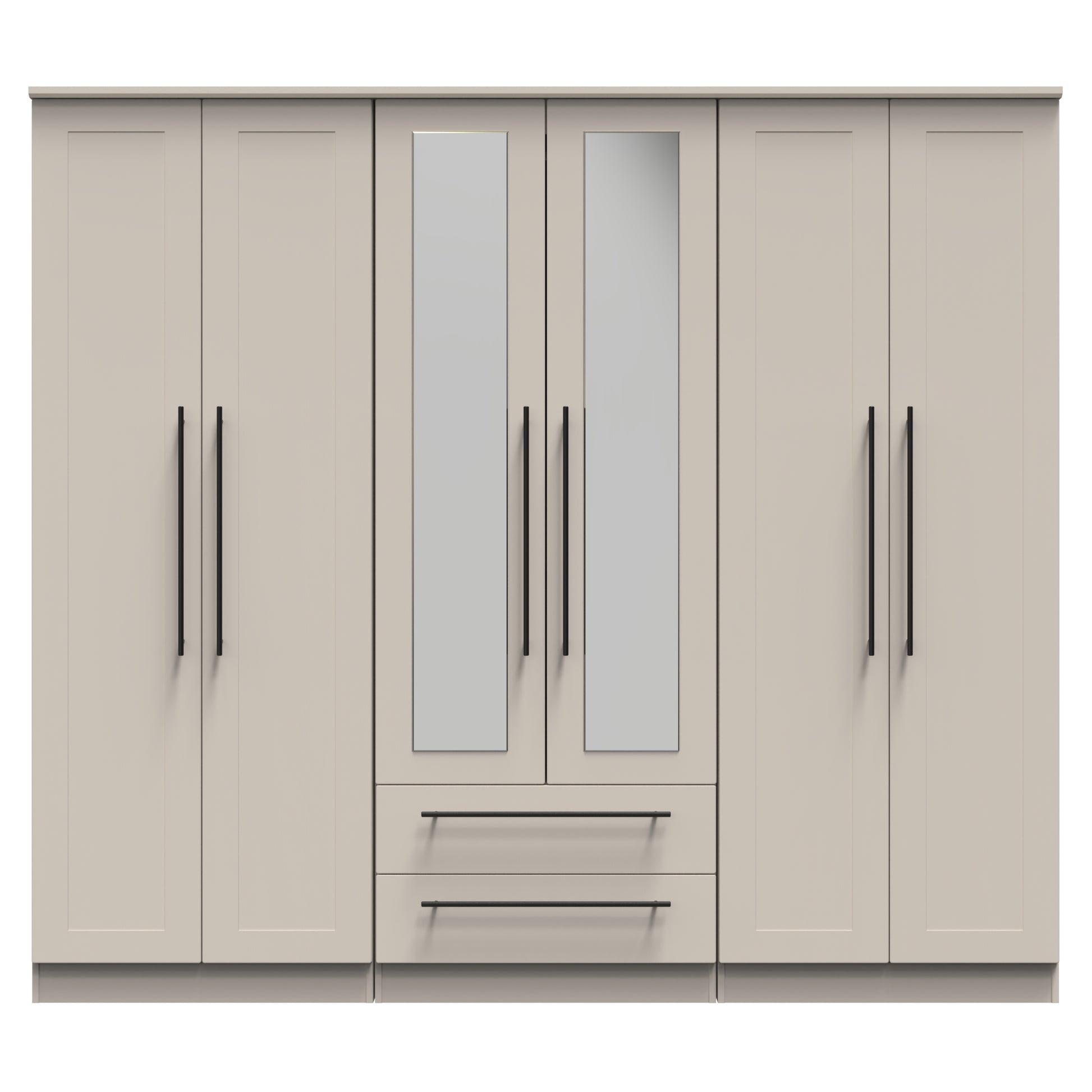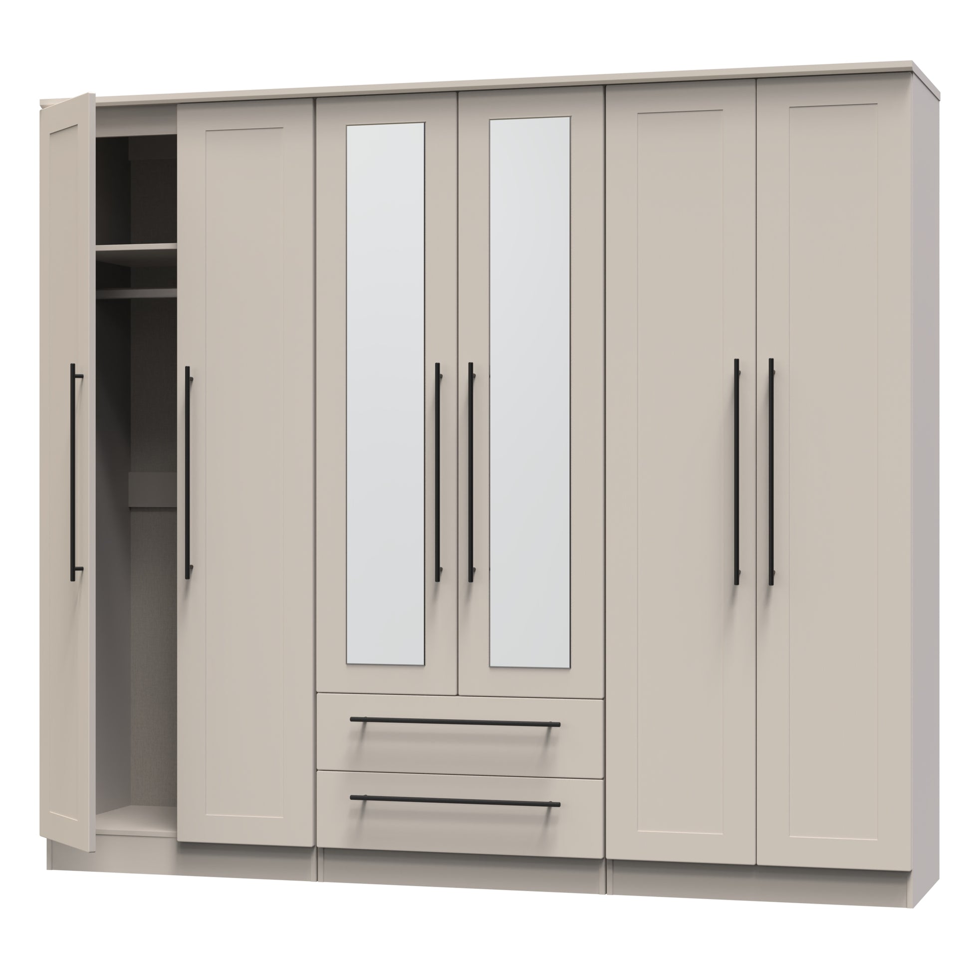 Beverley Tall Mirror Wardrobe Off-White 6 Doors 2 Shelves 2 Drawers 222cm