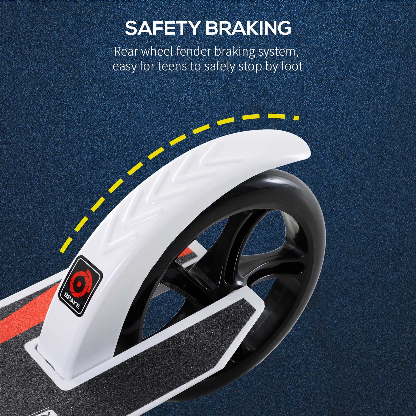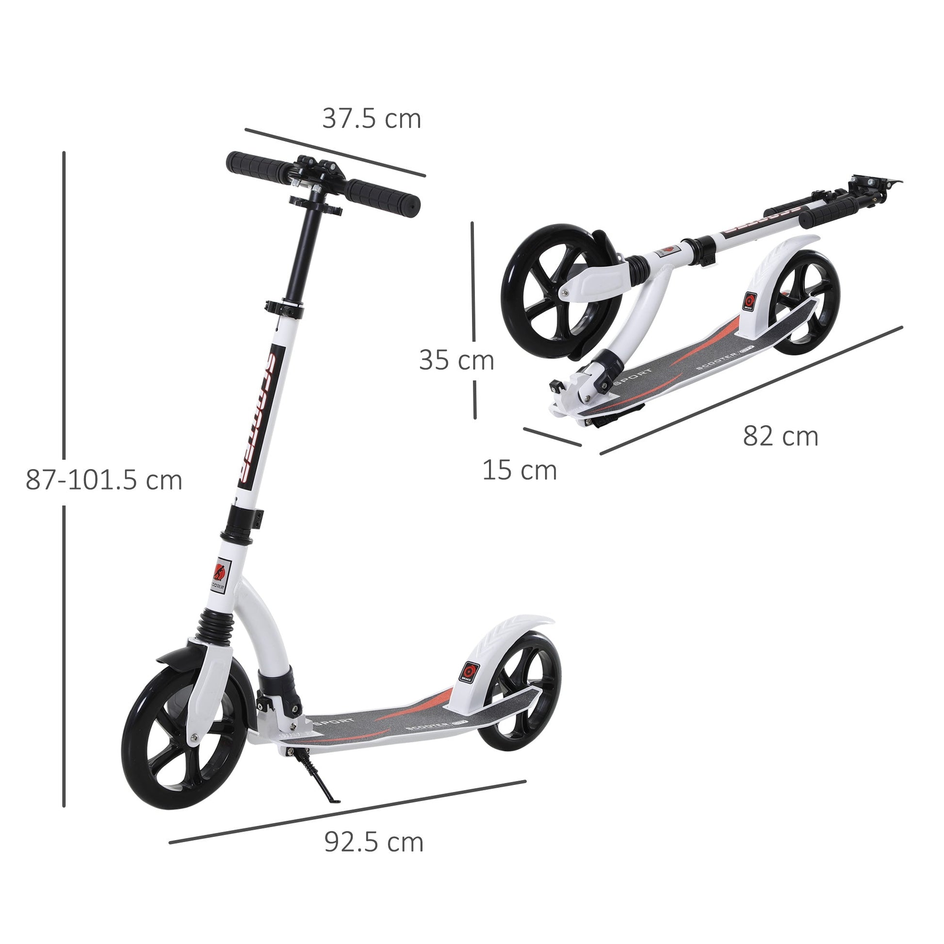 Cut down time spent getting around town with this white and black kick scooter from HOMCOM. Using aluminium to ensure a frame which is just as durable and reliable as it is lightweight, the scooter is made with a wealth of impressive features for the ultimate ride: a three-level adjustable handlebar, a wide foot board, comfortable grip handles with a back brake – giving you two ways to stop whilst whizzing along. Safe as it is fun, two slip-resistant tyres pair with the shock mitigation system for a smooth and comfortable journey every time. A quick-fold design which allows it to be picked up and carried around easily. For children aged 14 years and above.