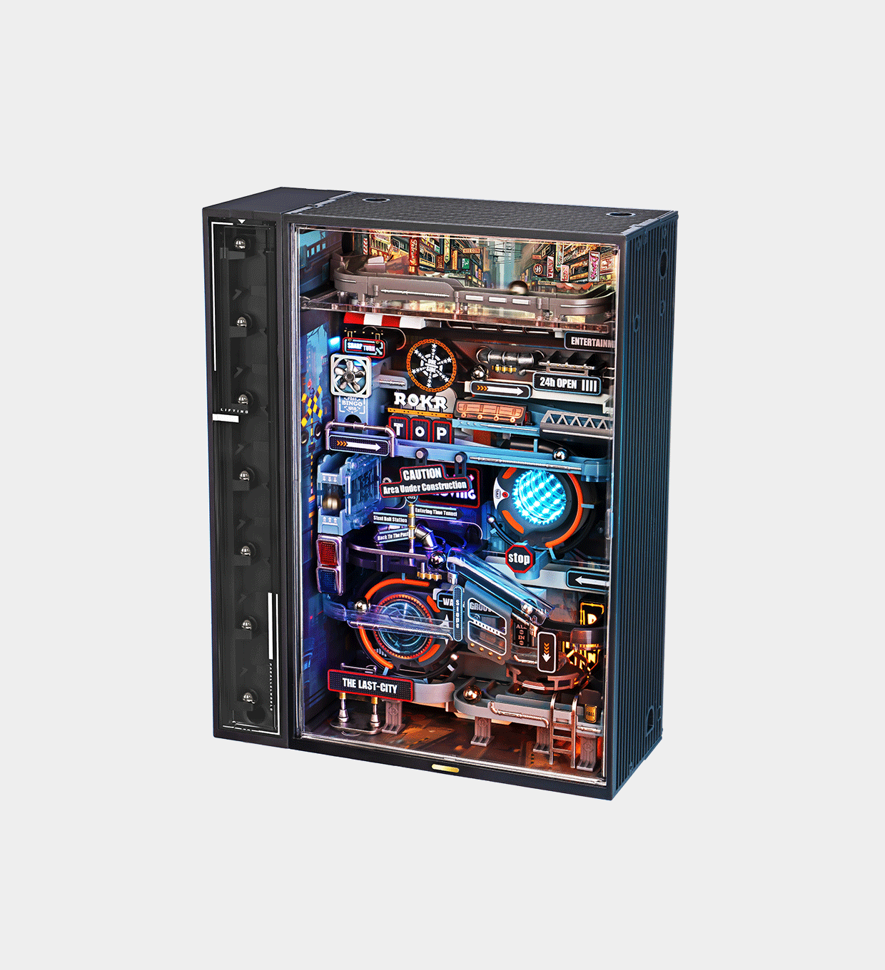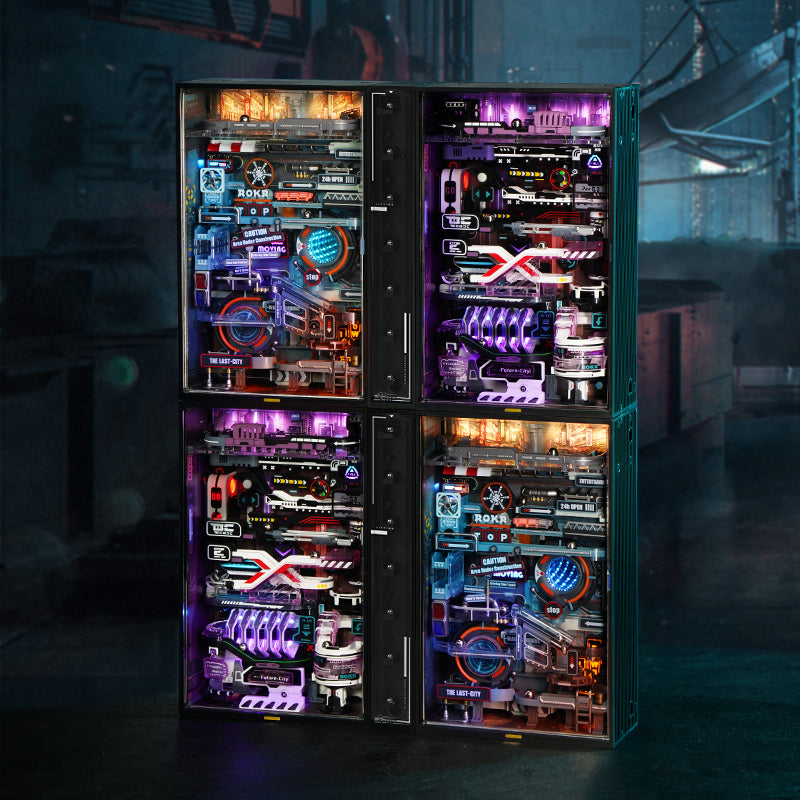 A cyberpunk-inspired DIY miniature model building kit with a fully automated marble lift. Connect via type-C, tap to start, and enjoy two modes: marble running or lighting display.