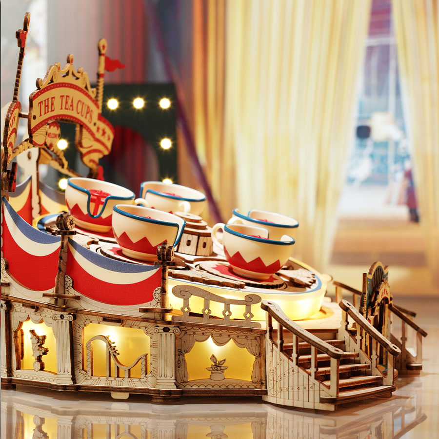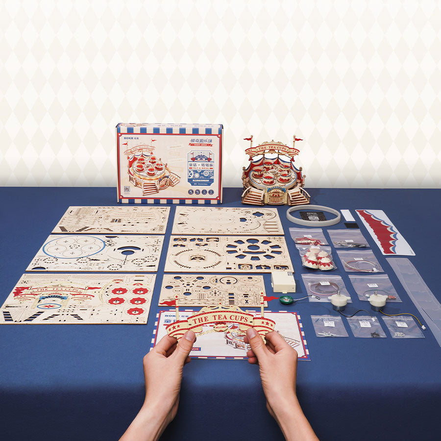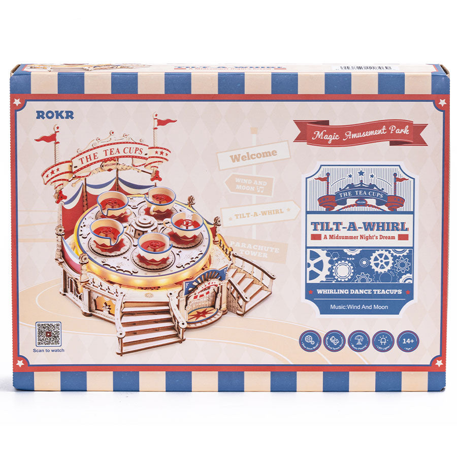 ROKR Tilt-A-Whirl EA04 is a DIY music box 3D wooden puzzle kit of the Magic Amusement Park Series. The design is based on the classic spinning teacups of the current major amusement parks, with the outer decoration of the gypsy circus tent in the 18th century, presenting the amazing charm of time and space.