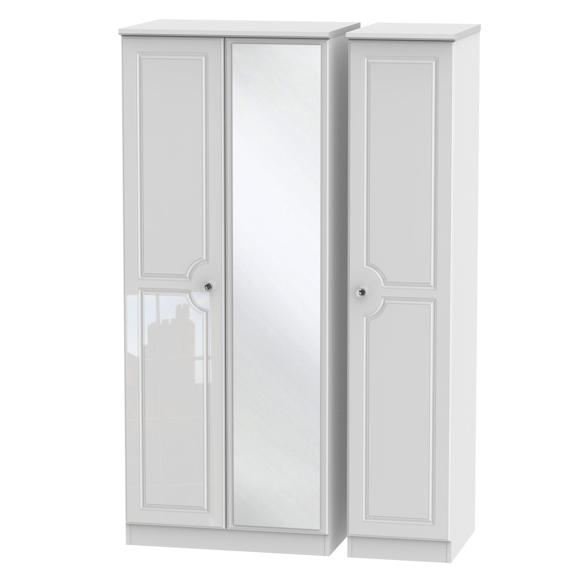 This full height triple 3 door wardrobe is perfect for any bedroom when a normal wardrobe is just not large enough. Also features a full height single mirrored door. This is a stylish extensive range of bedroom furniture. It is beautifully finished with a high gloss veneer, featuring crystal handles to suit a glamorous lifestyle. Easy to maintain with scratch resistance surfaces. All our furniture is made to order in the United Kingdom, to the highest quality. It is delivered within 10 working days direct to your location of choice by one of our two man delivery teams, and comes fully assembled (although legs may be removed to prevent damage in transit). Part of the Balmoral Collection.